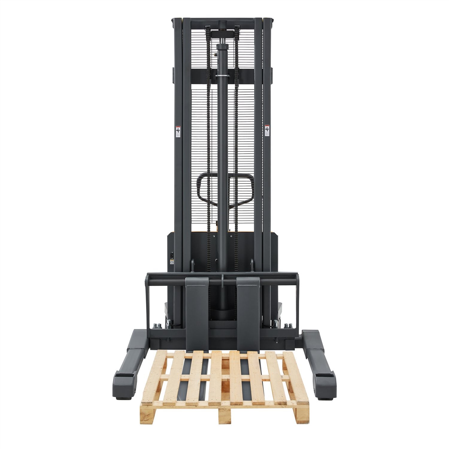 Powered by a 1.5 kW motor and 12V/100Ah battery, this straddle-leg stacker offers adjustable forks, speed-controlled lifting, and comprehensive safety protection for hard, flat floors.