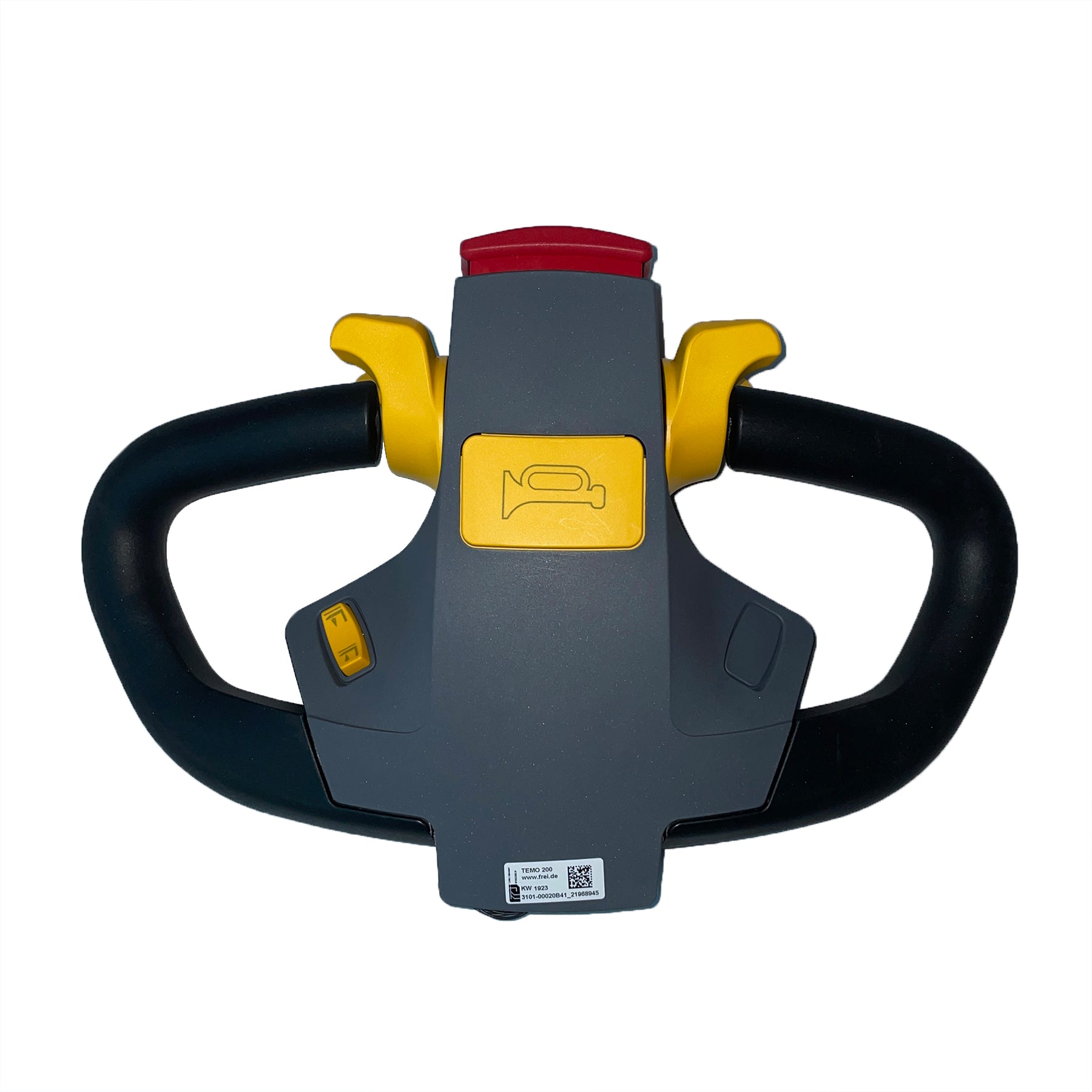 With control buttons for lifting and lowering knob. Yellow accelerator to operation movement forward and backward. Emergency reverse button for safety control.